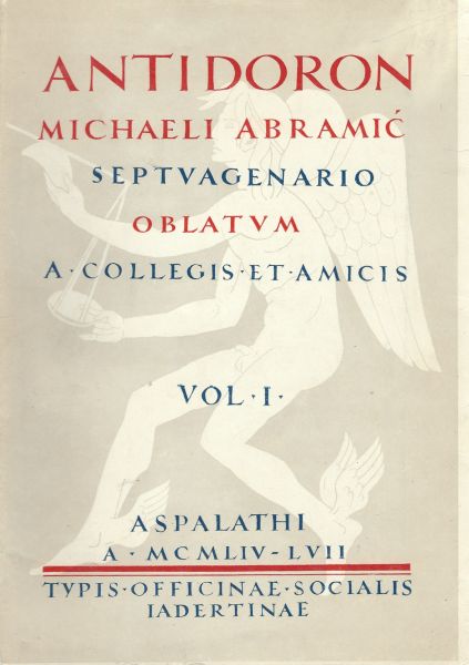 + XXLII tabli. Vjesnik za arheologiju i historiju dalmatinsku LVI-LIX/1954-57. Zbornik radova posvećenih M. Abramiću. Sadržaj: Mate Suić: Novo o Kairosu; Ernst Sprockhoff: Seddin - Sarajevo; Antun Mayer: Duklja i Dioklecijan; Stipe Gunjača: Postojanje jednog centra za izrađivenje starohrvatskog nakita; Ejnar Dyggve: Oltarna pregrada u krunidbenoj crkvi kralja Zvonimira itd.