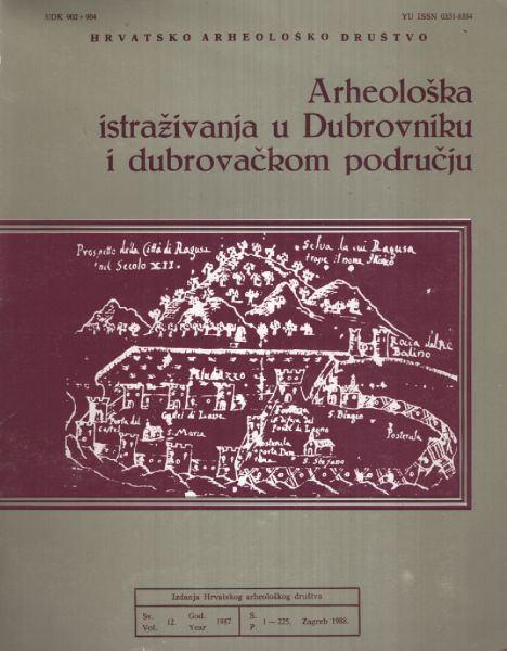 Znanstveni skup Dubrovnik, 1.-4.X.1984. Sadržaj: 1. Vinko Foretić: Pisana povijesna vrela o najranijim stoljećima Dubrovnika; 2. Josip Stošić: Prikaz nalaza ispod Katedrale i Bunićeve poljane u Dubrovniku; 3. Željko Rapanić: Marginalija o "postanku" Dubrovnika; 4. Šime Batović: Osvrt na područje Dubrovnika u prapovijesti; 5. Zorko Marković: O nekim kronološkim pitanjima eneolitičkih i brončanodobnih kultura južne Dalmacije i njezina zaleđa; 6. Marin Zaninović: Villae rustice u području Epidaura ; 7. Ivo Bojanovski: Ad CIL III, 1741, Obod kod Cavtata (Epidaurum) etc. Izdanja Hrvatskog arheološkog društva Svezak 12. Sažetci na engleskom, njemačkom i francuskom jeziku.
