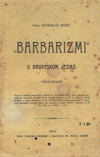 Ovo je ključno purističko djelo Vatroslava Rožića, jezičara poznatog po svojim nastojanjima da očisti hrvatski jezik od tuđica i nepravilnih oblika. Ovaj jezični savjetnik, izvorno objavljen u više izdanja početkom 20. stoljeća (prvo 1904., drugo 1908., a najopsežnije je upravo ovo, treće 1913. godine), abecednim redom obuhvaća preko tisuću riječi i izraza koje autor smatra "barbarizmima, neologizmima i arhaizmima". Rožić je bio izraziti vukovac po opredjeljenju te je smatrao da se hrvatski književni jezik treba temeljiti na štokavskome narječju, onakvom kakvo je zabilježeno u narodnome govoru. Svoje jezične stavove gorljivo je branio, zbog čega je često bio kritiziran kao pretjerani "čistunac". Djelo navodi riječi i oblike koje Rožić smatra nepravilnima, predlažući istovremeno pravilne zamjene. Na primjer, smatrao je da je "djelokrug" loša kovanica prema njemačkom "Wirkungskreis", te je umjesto toga predlagao "područje". Također je smatrao da "djetinstvo" nije književno, nego da treba biti "djetinjstvo". U svojoj borbi protivio se i raznim utjecajima, uključujući vlaške i turske riječi, kao i ruskim i češkim riječima koje su bile prisutne u tadašnjem jeziku. Iako su njegovi stavovi bili predmet rasprava, "Barbarizmi" ostaju značajan doprinos hrvatskom jezikoslovlju i važan izvor za razumijevanje jezične situacije i purističkih tendencija s početka 20. stoljeća.