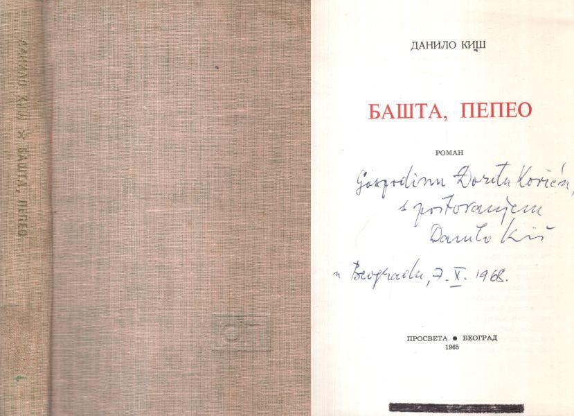 Prvo izdanje. S datiranom posvetom i potpisom autora. Danilo Kiš (Subotica, 22. veljače 1935. – Pariz, 15. listopada 1989.) bio je srbijanski je književnik židovskog podrijetla. Danilo Kiš je pisao pripovijetke, romane, drame, pjesme, eseje i polemičke rasprave, a prevodio je s ruskog, mađarskog, francuskog i engleskog jezika. Njegova prva knjiga objavljena je 1962. godine, a sadrži dva kratka romana: Mansarda i Psalam 44. Najviša čitateljska priznanja i istinsku slavu dobio je za roman Bašta, pepeo.