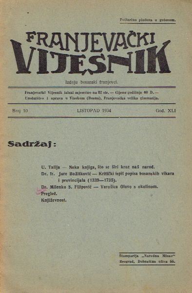 Sadržaj: Jure Božitković: Kritički ispit popisa bosanskih vikara i provincijala (1339-1735); Milenko S. Filipović: Varošica Olovo s okolinom itd.