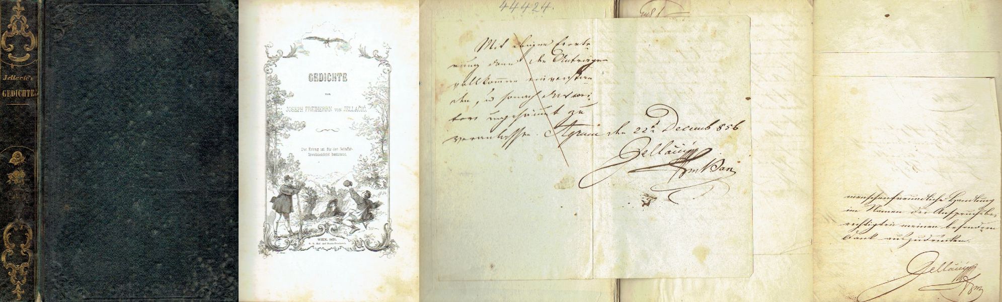 Lirske pjesme i drame u 3 čina: Rodrigo i Elvira. Sa dva potpisa, priložena s vlastoručnim tekstom samog autora. Josip Jelačić Bužimski (Petrovaradin, 16. listopada 1801. – Zagreb, 20. svibnja 1859.), bio je general i ban hrvatski, dalmatinski i slavonski od 1848. do 1859. godine, član plemićke obitelji Jelačić, te jedan od najznačajnijih hrvatskih političara, kako u 19. stoljeću, tako i u cijeloj povijesti Hrvata. Ukinuo je kmetstvo i sazvao prve izbore za Hrvatski sabor. Kao vojskovođa pobijedio je u nizu bitaka protiv ustanika u Habsburškoj Monarhiji za vrijeme Revolucije u Mađarskoj 1848. godine. U Hrvatskoj se slavi kao nacionalni junak.