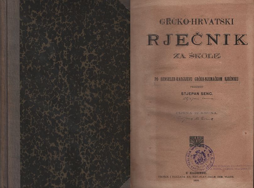 Prvo izdanje poznatog Grčko - hrvatskog rječnika. Priredio i uredio po Benseler-Kaegijevu rječniku Stjepan Senc.