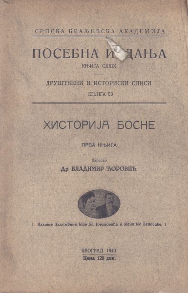 Vladimir Ćorović je rođen 27. oktobra (15. oktobra po starom kalendaru) 1885. godine u Mostaru, u poznatoj srpskoj trgovačkoj porodici, njegov brat je Sveozar Ćorović, jedan od poznatijih srpskih pripovjedača iz hercegovačkog kraja. Vladimir Ćorović bavio se historijom Bosne i Hercegovine i Srbije. Napisao je veliki broj radova kojima je utjecao na razvoj historiografije u BiH i Srbiji, a među njima i Historiju Bosne (1940) kojom je sintetizirao svoj pristup historiji srednjovjekovne Bosne Poginuo je 17. aprila 1941. u avionskoj nesreći iznad Grčke, nakon što je pokušao emigrirati sa većinom tadašnjih srpskih uglednika u inostranstvo. Naslovnica i prve dvije stranice su oštećene.