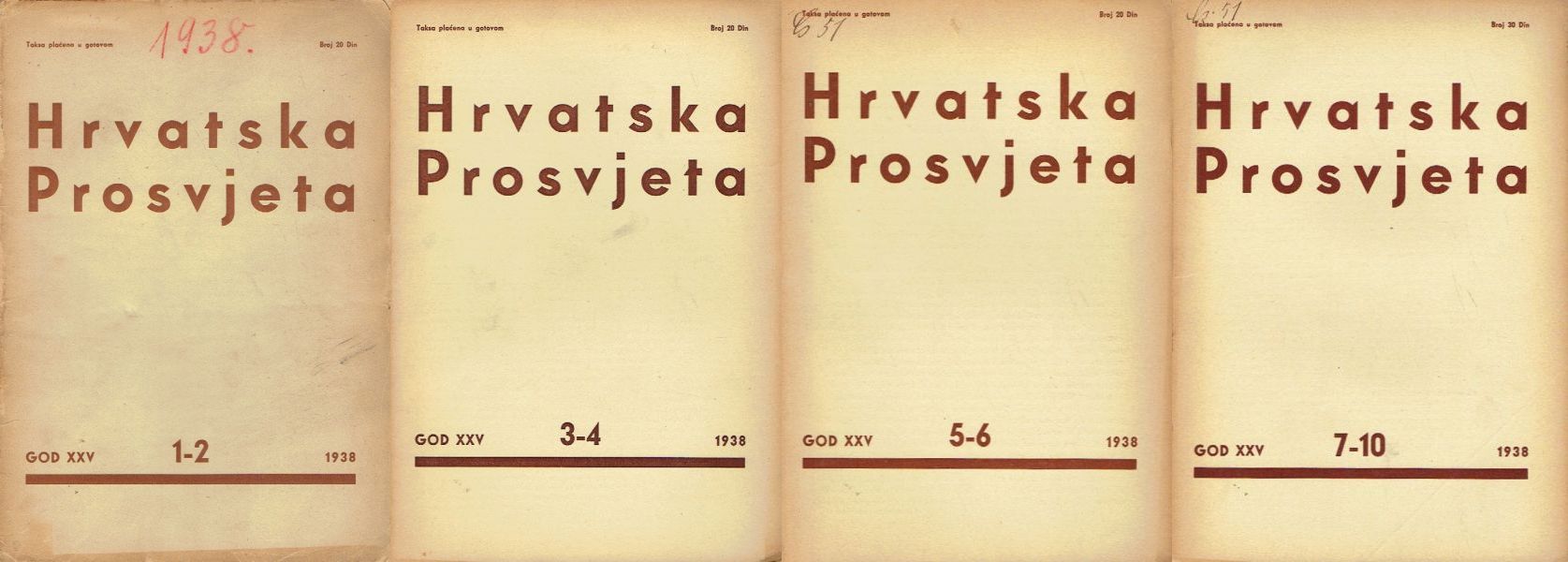 Kompletno godište. Hrvatska prosvjeta je bio hrvatski katolički mjesečnik. U impresumu se definirao kao časopis za književnost i umjetnost. Uređivali su ga te pisali za nj: Petar Grgec, Ferdo Rožić, Ljubomir Maraković, Hijacint Bošković i Mate Ujević. List je izlazio od 1914. godine sve do 1940. godine. Sadržaj ovog kompleta: Stjepan Zimmermann: Kultura i smisao života; Nikola Žic; Seobe Hrvata u južnu Istru I-III; Antun Dabinović: Nove rimske iskopine; Josip Zidarić: O društvenosti među Hrvatima; Cys: Nova situacija nakon münchenskog sporazuma - Pitanje kolonija - Rasizam i Vatikan itd.