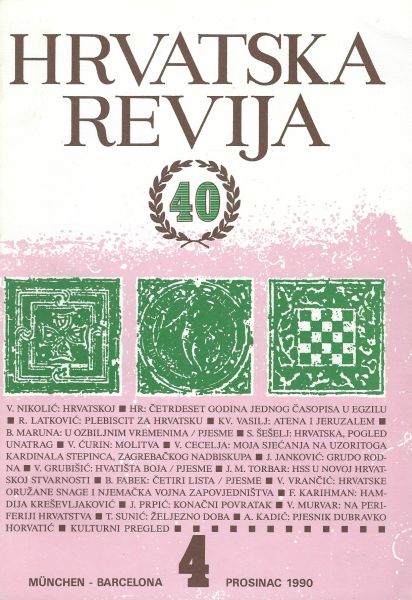 Sadržaj: Radovan Latković: Plebiscit za Hrvatsku; Vilim Cecelja: Moja sjećanja na uzorita kardinala Stepinca, zagrebačkog nadbiskupa; Vjekoslav Vrančić: Hrvatske oružane snage i njemačka vojna zapovjedništva; Ferid Karihman: Hamdija Kreševljaković; Vatro Murvar: Na periferiji hrvatstva itd.