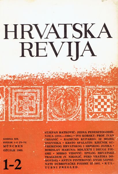Sadržaj: Stjepan Ratković: Jedna pedesetogodišnjica (1918.-1968.); Ivo Korsky: Prof. Ivan Oršanić; Krsto Spalatin: Rječnik suvremenog hrv. i srp. rječnika itd.