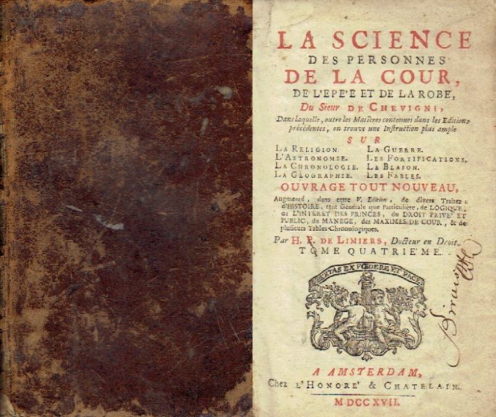 La Science des personnes de cour, d'épée et de robe est une encyclopédie éditée a Paris, ou paraît sa premiere édition en deux volumes in-8° chez J. de Nully en 1706. Elle est aussitôt reprise a Amsterdam par François L'Honoré puis Chatelain, et connut ainsi plusieurs éditions a partir de 1707. Cet ouvrage de référence, synthétique, qui représentait les connaissances de l'époque rencontra un vif succes. L'ouvrage est dédié au prince d'Orange et de Nassau.