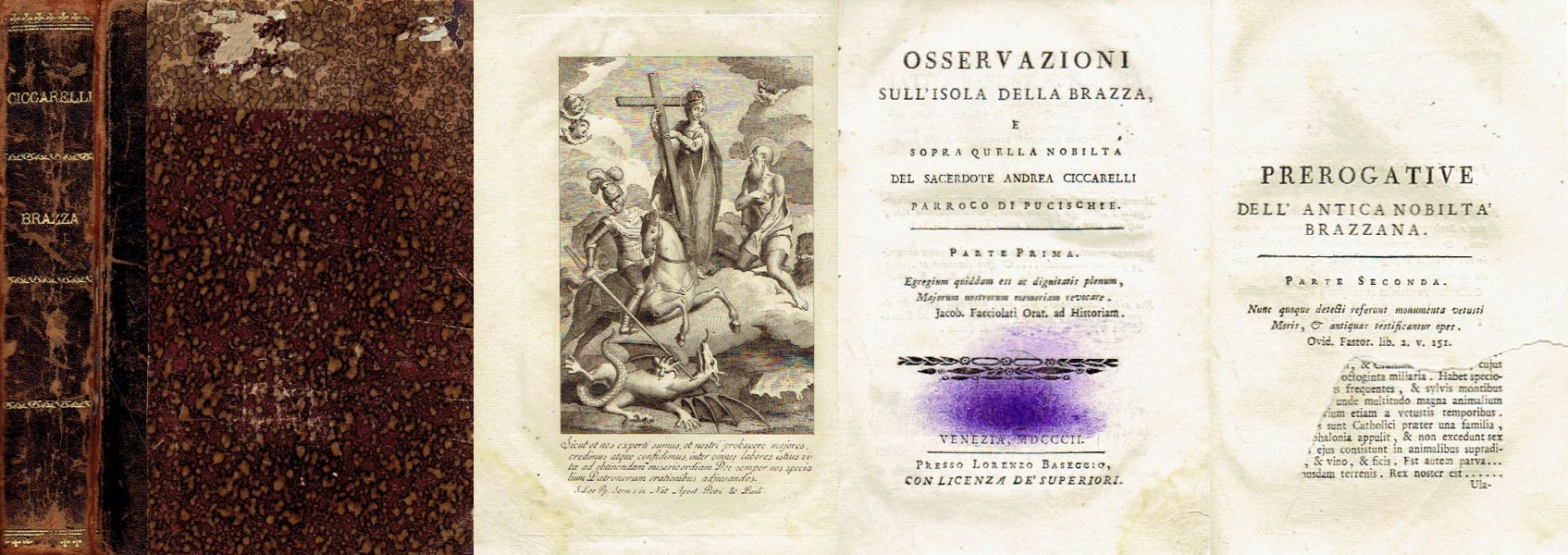 Due volumi in un libro. Ciccarelli, Andrea, storico croato (Pučišća su Brač, 29 marzo 1759 - Pučišća, 14 ottobre 1823). Pastore a Pučišća (1795–1810). Ha raccolto e studiato materiale sulla storia di Brač, Spalato e Trogir. Con lo stemma dell'isola di Brazza.