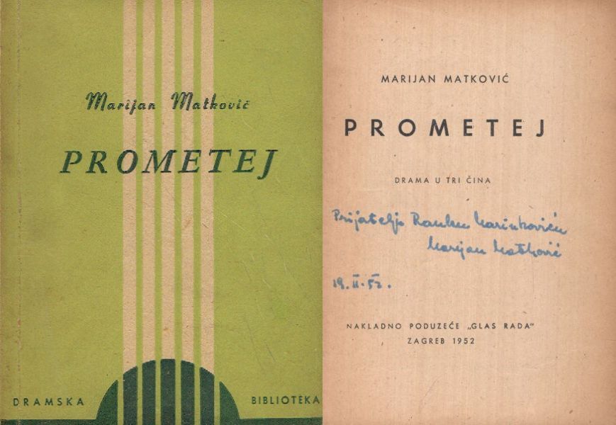 S datiranom posvetom Ranku Marinkoviću i s potpisom autora. Prometej je drama u tri čina hrvatskog književnika Marijana Matkovića, prvi put objavljena 1952. godine. Drama čini središnji dio njegove poznate dramske trilogije pod zajedničkim naslovom "I bogovi pate", uz drame Heraklo i Ahilova baština. Matković koristi antički mit o Prometeju kako bi progovorio o suvremenim problemima. Njegov Prometej nije samo buntovnik, već nositelj povijesne svijesti koji se okreće ljudima kako bi uveo red u kaos. Djelo istražuje odnos pojedinca i vlasti, slobode i nužnosti, te moralnu odgovornost intelektualca u modernom društvu. Napisana je u krležijanskom duhu, s naglašenim ekspresionističkim i esejističkim elementima. Radnja je smještena u mitski okvir, ali s jasnim aluzijama na sudbinu čovjeka u 20. stoljeću. Drame iz ciklusa "I bogovi pate" smatraju se vrhuncem Matkovićeva dramskog stvaralaštva, u kojima autor vodi intelektualni "dijalog s junakom" i preispituje temeljne vrijednosti civilizacije.