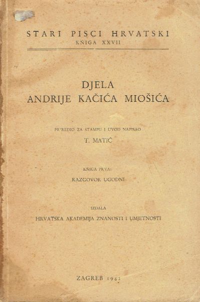 Djela Andrije Kačića Miošića I. Priredio za štampu i uvod napisao T. Matić. Manjka stražnja korica.
