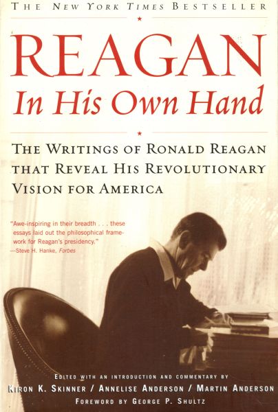 "Reagan, In His Own Hand" is a collection of more than 600 handwritten speeches, essays, and radio addresses by Ronald Reagan written primarily between 1975 and 1979. The book provides insight into the intellectual underpinnings of what would become the "Reagan Revolution." The documents prove that Reagan was the real author and intellectual force behind his policies, not just a "Great Communicator" who reads other people's minds. The records cover a wide range of topics, including foreign policy (the fight against communism and the Cold War), the economy, welfare reform, and personal reflections on American values. The book includes photographs of the original handwritten pages with Reagan's own corrections and notes.
