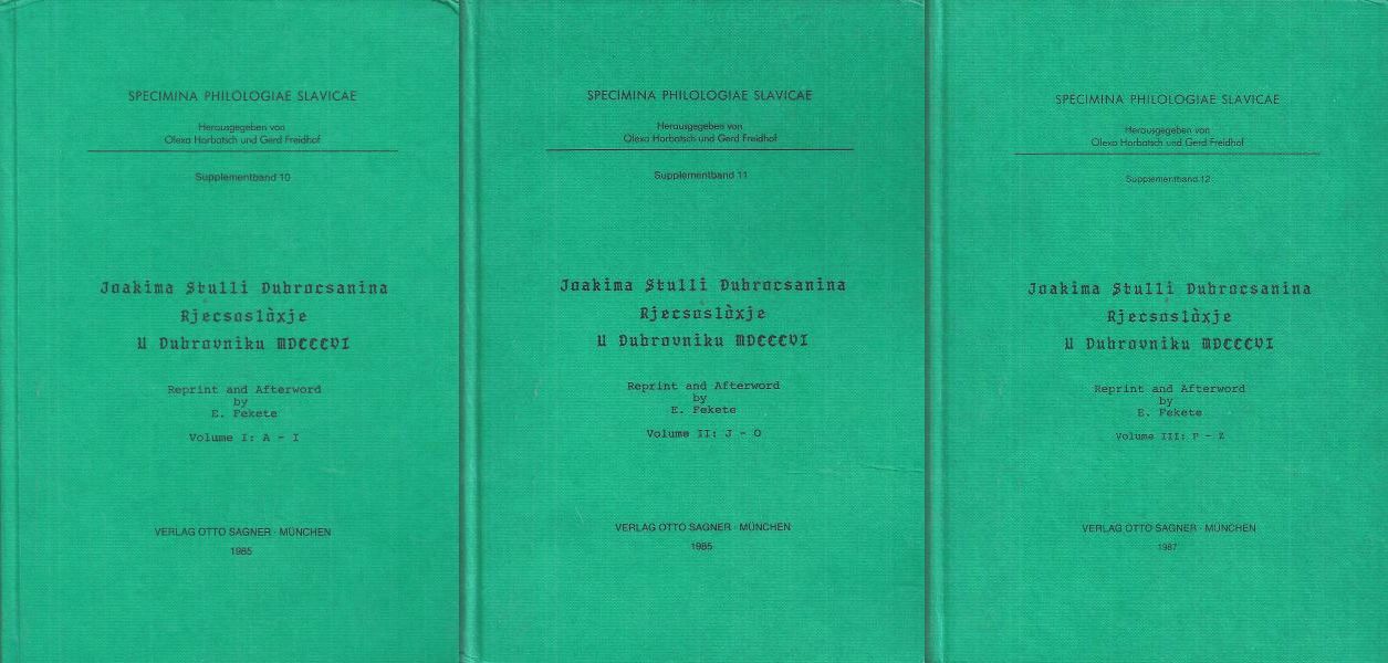 Pretisak u tri knjige. Pogovor Egon Fekete. Fra Joakim Stulli (1730. – 1817.) je u razdoblju između 1801. i 1810. objelodanio svoj trojezični rječnik, koji je postao riznica hrvatskog jezičnog blaga. Stullijev trojezični rječnik ima ukupno šest svezaka. Prva dva sveska tvore Latinsko – talijansko – hrvatski rječnik (Lexicon latino – italico – illyricum), tiskani su u Budimu 1801, zatim slijede dva sveska Hrvatsko – talijansko – latinskog rječnika (Rjecsosloxje ilirsko – italiansko – latinsko), tiskanog u Dubrovniku 1806., te Talijansko – hrvatsko – latinski rječnik (Vocabolario italiano – illirico – latino), tiskan u dva sveska u Dubrovniku 1810. godine.