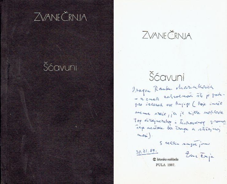S datiranom posvetom Ranku Marinkoviću s potpisom autora. Šćavuni je naslov knjige istaknutog istarskog književnika i kulturologa Zvane Črnje, objavljene 1987. Knjiga je specifična po svom sadržaju i značaju za istarsku kulturu. Riječ je o zbirci koja sadrži dramske tekstove i knjige snimanja. Uključuje djela poput TV-romana "Zašto si tužan, Clovio?" i dramskog teksta "Marule moj" (podnaslovljen kao "Hod pod zvijezdama u četiri prikazanja"). Izraz "Šćavuni" (izvedenica od mletačkog Schiavi) povijesni je, često pejorativni naziv za Slavene (Hrvate i Slovence) u Istri i Dalmaciji. Črnja ga koristi kako bi naglasio povijesni identitet, otpor i sudbinu istarskog čovjeka, što je središnja tema njegova opusa. Knjiga je tiskana kao prvi svezak u sklopu njegovih Sabranih djela. Zvane Črnja je kroz ovo i druga djela nastojao definirati istarski identitet unutar hrvatskog kulturnog kruga, boreći se protiv fašističkog potiranja slavenskih korijena u Istri. Zvane Črnja (Črnjeni kraj Žminja, 1920. – Zagreb, 1991.) bio je jedan od najistaknutijih hrvatskih književnika, kulturologa i javnih djelatnika 20. stoljeća, posebno značajan za očuvanje istarskog identiteta i čakavštine. Pisao je poeziju, prozu, eseje i drame. Njegova zbirka Istrijanska primisli smatra se jednim od temelja moderne čakavske lirike. Autor je kapitalnog djela "Kulturna historija Hrvatske", u kojem je sintetizirao razvoj hrvatske kulture kroz stoljeća. Bio je glavni utemeljitelj Čakavskog sabora i dugogodišnji tajnik ove važne kulturne institucije koja i danas djeluje na promicanju čakavske baštine. Pokrenuo je i uređivao brojne časopise i edicije, uključujući prestižnu seriju Istra kroz stoljeća. Iako je bio sudionik NOB-a i član Partije, zbog svojih je stavova bio zatvoren na Golom otoku, što je ostavilo traga na njegovom životnom putu. Danas njegovo ime nose brojne ulice, škole i književne nagrade, čime se čuva sjećanje na njegov neizmjeran doprinos hrvatskoj