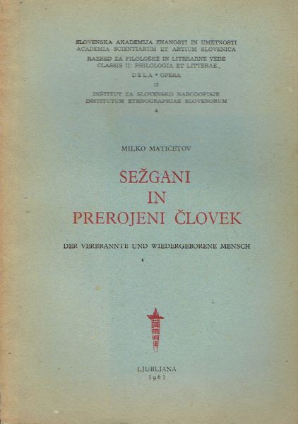 Obsežna doktorska disertacija slovenskega narodopisca in folklorista Milka Matičetova. Analiziral je ljudsko pripovedno in pesniško izročilo o človeku, ki je bil sežgan (ali kako drugače uničen) in nato čudežno prerojen oziroma pomlajen. Zusammenfassung: Der verbrannte und wiedergeborene Mensch. DOSTUPNO PREKO INTERNETSKE PRODAJE ODMAH, U DUĆANU U ROKU OD 24 SATA.