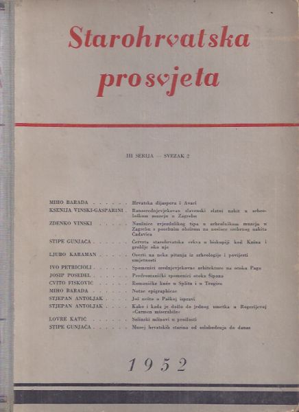 Sadržaj: Miho Barada Hrvatska dijaspora i Avari; Stipe Gunjača: Četvrta starohrvatska crkva u Biskupiji kod Knina i groblje oko nje; Cvito Fisković: Romaničke kuće u Splitu i Trogiru itd.