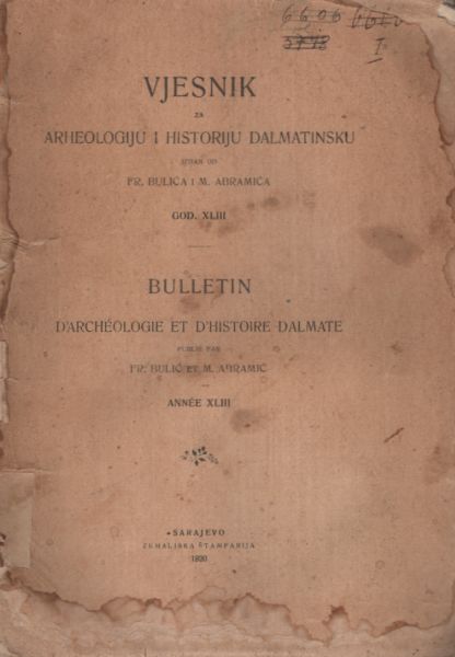 Sadržaj: Frane Bulić: Stridon (Grahovo polje u Bosni) rodno mjesto Svetoga Jeronima; Frane Bulić: Trovamenti antichi a Solta. Iscrizioni inediti; A. Milošević: Crkvica Sv. Petra u Bijeli u Boci Kotorskoj itd. Manjka stražnja korica.
